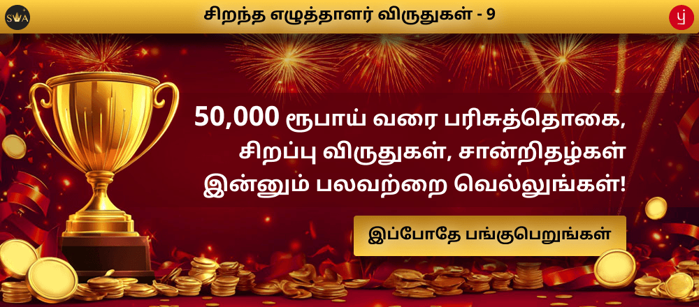 → முதல் 3 ரேங்க் பெறும் வெற்றியாளர்களுக்கு: ₹5000 ரொக்கப்பரிசு + மின்னஞ்சல் மூலம் வெற்றியாளர்சான்றிதழ் + பிரதிலிபியின் சமூக வலைத்தளத்தில் பிரத்யேகமாக 'எழுத்தாளர் பற்றிய பதிவு' இடப்படும்.