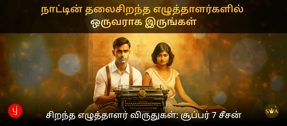 12 மொழிகள் மற்றும் மாநிலங்களில் இந்தியாவின் விருப்பமான விருதான 'சிறந்த எழுத்தாளர் விருதுகள்' போட்டியின் சூப்பர் 7 சீசனை அறிவிப்பதில் பிரதிலிபி பெருமைகொள்கிறது. இந்தப் புகழ்பெற்ற போட்டியானது தொடர்ச்சியாக லட்சக்கணக்கான வாசகர்களின் இதயத்தைத் தொடும் கதைகளைத் தொடர்ந்து உருவாக்கி வருகிறது. உங்களுக்கு புத்தம் புதிய கதைக்கருக்கள், கதாபாத்திரங்கள் மற்றும் எளிதில் பிரபலமாகும் கதைகளை எழுதும் சிறப்பான எழுத்துத் திறமை இருக்கிறதா? மேலும்  நீங்கள் ஒரு தொழில்முறை எழுத்தாளராக மாறவும் மற்றும் உங்கள் கதைகளின் ராயல்டி மூலம்  மாதவருமானம் ஈட்டவும் விரும்புகிறீர்களா? ஆம் என்றால், வாழ்த்துக்கள்,  உங்களைத்தான் பிரதிலிபி தேடிக்கொண்டிருக்கிறது!