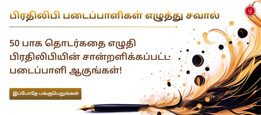 நீங்கள் எழுதுவதில் ஆர்வமுள்ளவரா? இந்தியாவின் மிகப்பெரிய ஆன்லைன் இலக்கிய தளமான பிரதிலிபியின் பிரத்யேக பயிற்சி சான்றிதழைப் பெற்று உங்கள் எழுத்துலக வாழ்க்கையை நிலைநாட்ட இது உங்களுக்கு ஒரு வாழ்நாள் வாய்ப்பு. வாழ்த்துக்கள்!