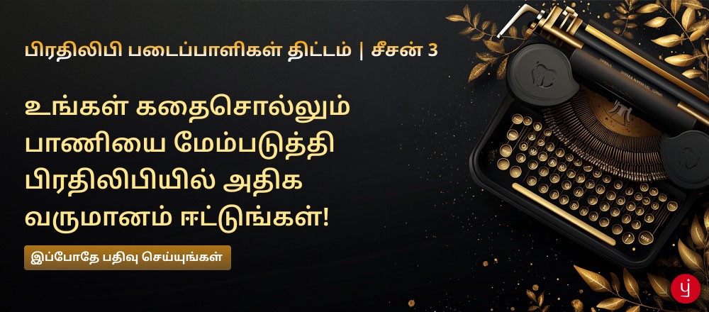 பிரதிலிபி படைப்பாளிகள் திட்டத்தில் பங்கேற்று ஆயிரக்கணக்கான எழுத்தாளர்கள் வெற்றிகரமாக சம்பாதிக்க தொடங்கியிருக்கிறார்கள். இது உங்களுக்கான வாய்ப்பு! பங்குபெற்று வளர்ச்சியடையுங்கள். இந்த தகவலை உங்களது எழுத்தாளர் நண்பர்களோடு பகிர மறக்காதீர்கள். அவர்களுக்கும் இது பயன்படலாம்!